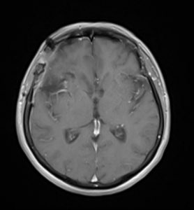 Η μετεγχειρητική αξονική τομογραφία εγκεφάλου δείχνει αφαίρεση της βλάβης χωρίς παρουσία επιπλοκών, και κυρίως χωρίς κάποιο έμφρακτο από τα εμπλεκόμενα αγγεία. Η ιστολογική εξέταση ανέδειξε μηνιγγίωμα, WHO Grade I.