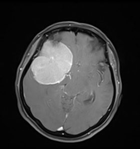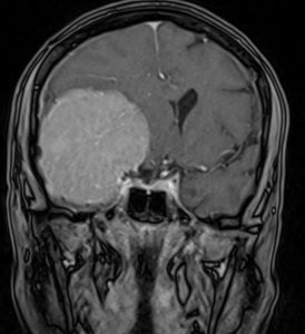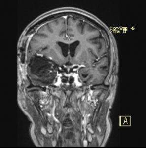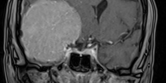 Ο απεικονιστικός έλεγχος με μαγνητική τομογραφία ανέδειξε ευμεγέθη εξεργασία δεξιά, συμβατή με μηνιγγίωμα πτέρυγας σφηνοειδούς οστού.