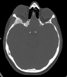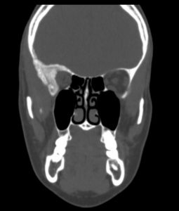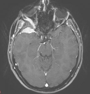 H Μαγνητική & Αξονική Τομογραφία εγκεφάλου ανέδειξε χωροκατακτητική εξεργασία στην περιοχή της πτέρυγας του σφηνοειδούς οστού, δηλ. του άνω (οροφή) και του πλαγίου τοιχώματος του οφθαλμικού κόγχου. Η εξεργασία επεκτείνονταν κατά μήκος της σκληράς μήνιγγας ενώ στην περιοχή του κροταφικού πόλου παρουσίασε ενδοκρανιακή επέκταση. Η πάχυνση του οστού του κόγχου προκαλούσε πίεση των περιεχομένων του κόγχου με αποτέλεσμα εξόφθαλμο.