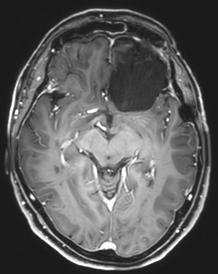 Η μετεγχειρητική μαγνητική τομογραφία εγκεφάλου δείχνει ολική εξαίρεση. Η ιστολογική εξέταση ανέδειξε μηνιγγίωμα (WHO I).